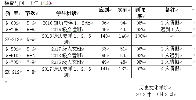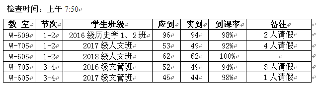 为进一步规范教学管理,维护正常教学秩序,确保教学工作顺利开展,2018年10月8日,德赢官网教学自查小组对上课班级师生到课情况进行了检查,现通报如下:
